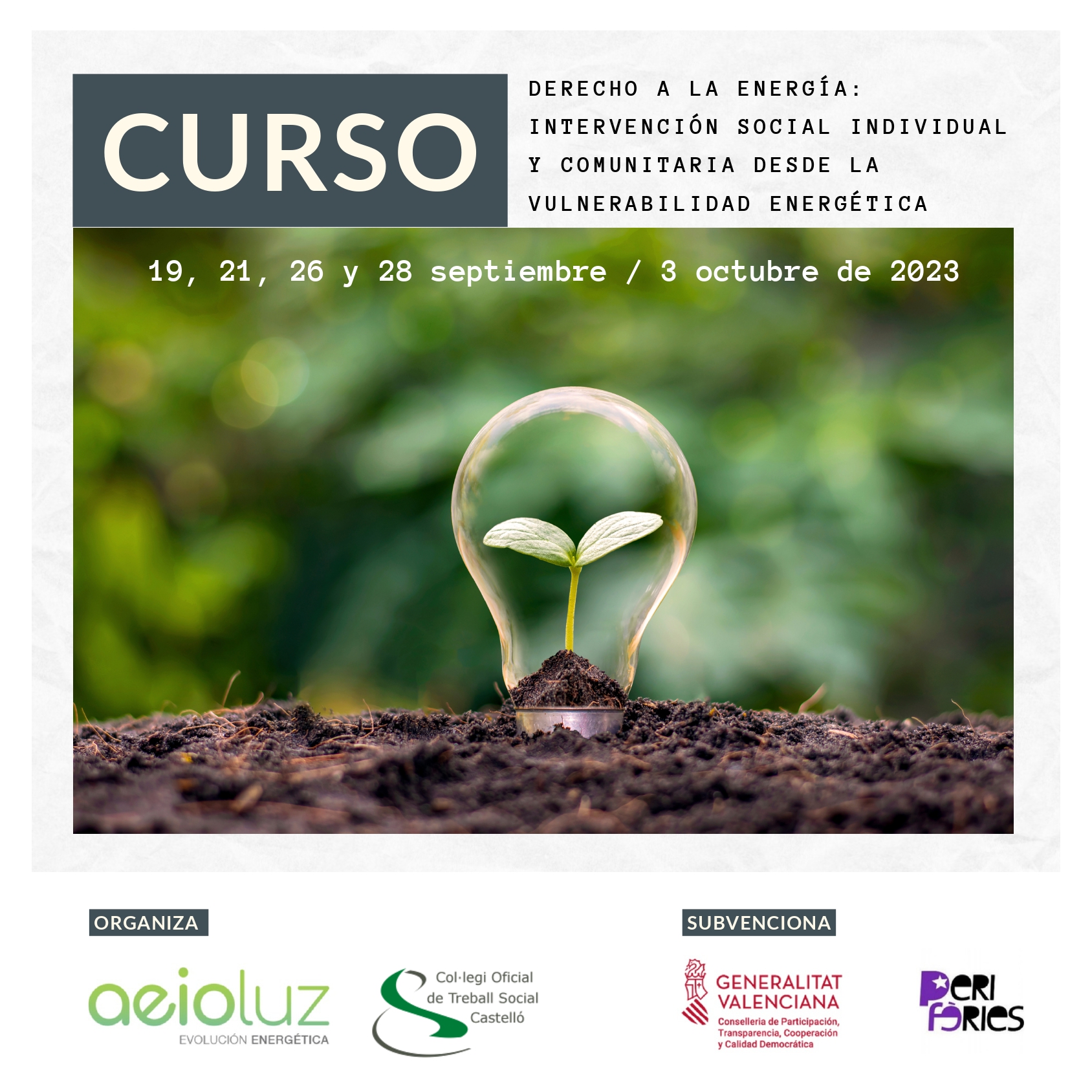 Estos son algunos de los muchos objetivos que se marca la formación ‘Derecho a la Energía: Intervención social individual y comunitaria desde la vulnerabilidad energética’. Un curso de vertiente práctica – irá acompañado por material didáctico y una guía de intervención social en vulnerabilidad energética – que se impartirá en cinco sesiones (19, 21, 26 y 28 de septiembre y 3 de octubre de 2023), de 16.30 a 20.30 horas en formato online y 20 horas de duración.