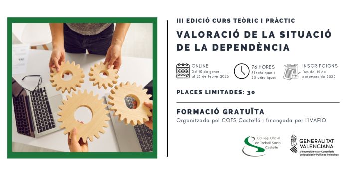 Castelló, 05/12/2022.- El dijous, 15 de desembre, a les 17.00 hores, s’obri la inscripció per a l’III Curs teòric i pràctic ‘Valoració de la situació de la dependència’, organitzat pel Col·legi Oficial de Treball Social de Castelló i finançat per l’Institut Valencià de Formació, Investigació i Qualitat dels Serveis Socials (IVAFIQ).