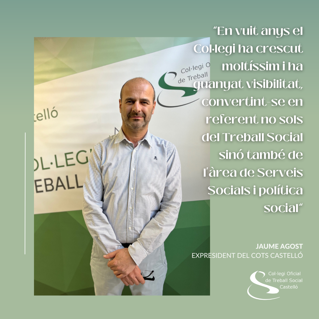 Castelló, 30/04/2024.- El Col·legi Oficial de Treball Social de Castelló acaba de proclamar a la seua nova junta de govern, que presidirà María José Pérez. Amb aquest relleu encara recent, Jaume Agost, president del Col·legi durant dos mandats consecutius – de 2016 a 2024 – fa balanç del treball realitzat en els seus vuit anys de govern i els reptes pendents. En aquest temps “el COTS Castelló, i la professió, han guanyat visibilitat i especialització en tots els àmbits on és present”, diu. Reconeix també que hi ha nous objectius en l’horitzó. Constituir oficialment el Consell Valencià de Treball Social – les bases del qual va asseure fa dues setmanes el Pacte de Benicàssim – per a reforçar la representativitat davant l’administració, és un dels més immediats. També incorporar a l’UJI el Grau en Treball Social i la figura de les i els treballadors socials a l’àrea d’emergències.