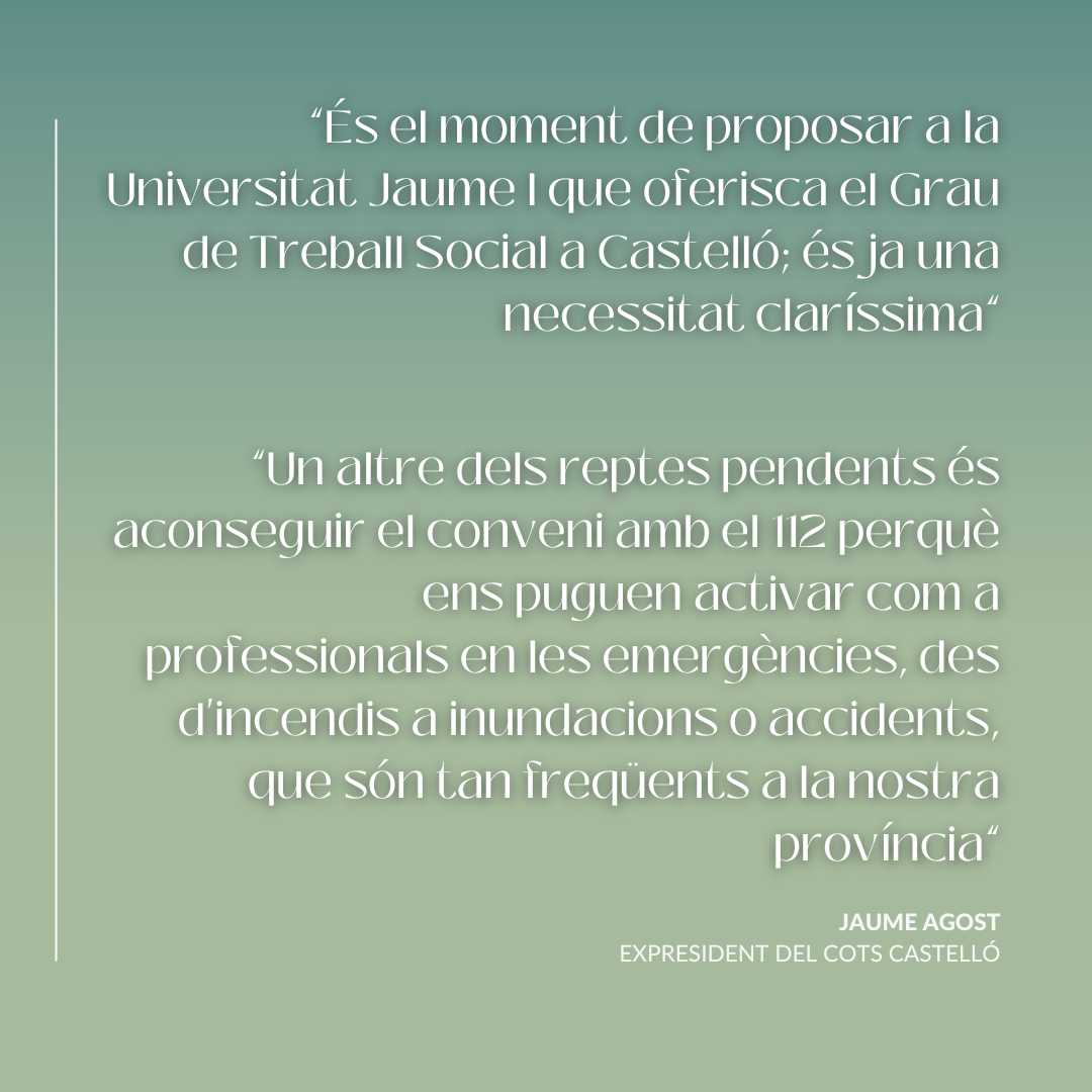 R.- Queda molt per fer, i així ho he deixat clar a la nova junta que ara ens ha rellevat. Per exemple, aconseguir el conveni amb el 112 perquè ens puguen activar en les emergències, des d’incendis a inundacions o accidents, que són tan freqüents a la nostra província. També considere que el Col·legi ha de proposar a la Universitat Jaume I que oferisca el Grau en Treball Social a Castelló. Crec que és el moment i que ja és una necessitat claríssima. En les últimes setmanes de la nostra junta ja vam iniciar el treball per a justificar eixa necessitat i plantejar-li-la a la rectora de l’UJI, Eva Alcón.