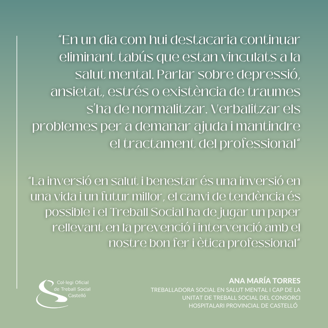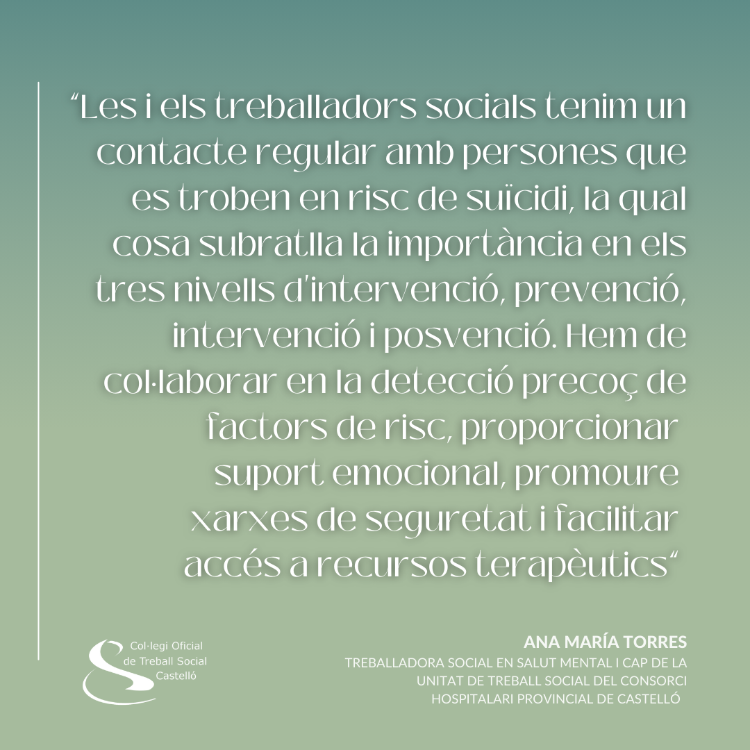 La treballadora social Ana María Torres, cap de la Unitat de Treball Social del Consorci Hospitalari Provincial de Castelló, reclama una intervenció que s’estenga més enllà de l’àrea sanitària per a reforçar la xarxa de protecció a persones vulnerables. Defensa el paper del TS en la detecció precoç de factors de risc, la proporció de suport emocional i la promoció de xarxes de seguretat i l’accés a recursos terapèutics.