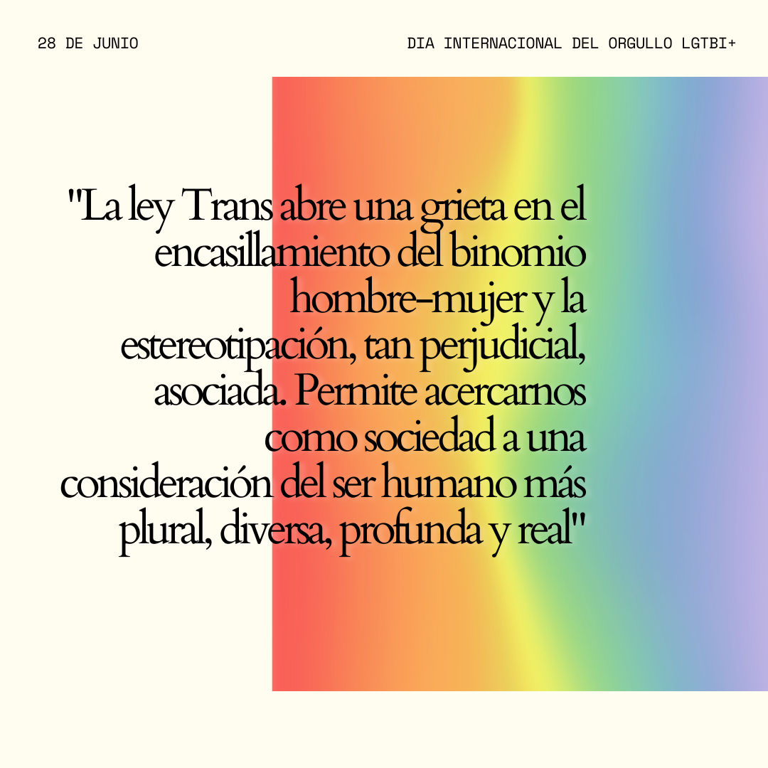 “El sistema nos pretende iguales bajo el paraguas de los estereotipos normativos sexo/género”. La ley abre una grieta en el encasillamiento del binomio hombre-mujer y la estereotipación, tan perjudicial, asociada. Permite acercarnos como sociedad a una consideración del ser humano más plural, diversa, profunda y real.
