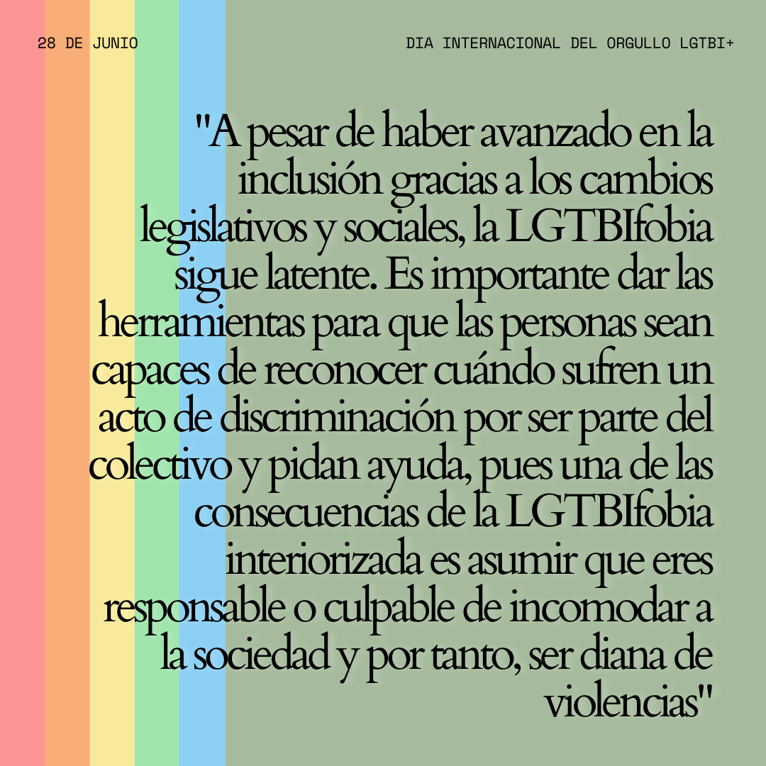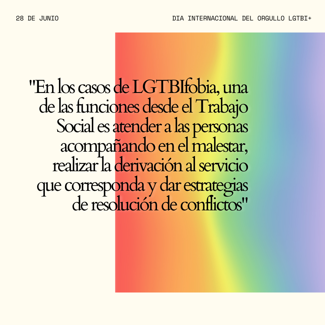 Desde el Trabajo Social es fundamental dar las herramientas para que las personas sean capaces de reconocer cuándo sufren un acto de discriminación por ser parte del colectivo y pidan ayuda, pues una de las consecuencias de la LGTBIfobia interiorizada es asumir como propia una responsabilidad y/o culpabilidad por resultar incómodo a la sociedad y, por tanto, asumir ser diana de violencias. Como trabajadoras sociales, acompañamos en el malestar, realizamos la derivación al servicio que corresponda y damos estrategias de resolución de conflictos.