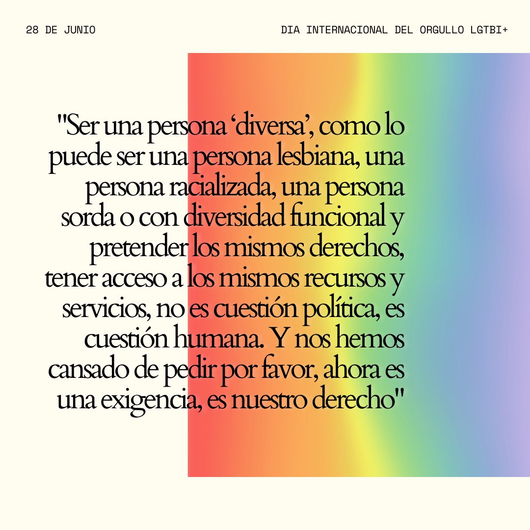 Por desgracia, todavía nos vemos obligadas a recordar que la igualdad y la no discriminación es un principio jurídico universal, reconocido como un derecho fundamental en nuestro ordenamiento jurídico y plasmado en el artículo 2 de la Declaración Universal de Derechos Humanos. Ser una persona ‘diversa’, como lo puede ser una persona lesbiana, una persona racializada, una persona sorda o con diversidad funcional y pretender los mismos derechos, tener acceso a los mismos recursos y servicios, no es cuestión política, es cuestión humana. Y nos hemos cansado de pedir por favor, ahora es una exigencia, es nuestro derecho. Se debe hacer un trabajo de profunda reflexión para que, como sociedad, nos demos cuenta de que la normatividad no es lo común ni la mayoría, que la sociedad es diversa en sí misma. Y todas en algún momento de nuestras vidas, podemos formar parte de algún grupo social que históricamente ha estado vulnerabilizado.