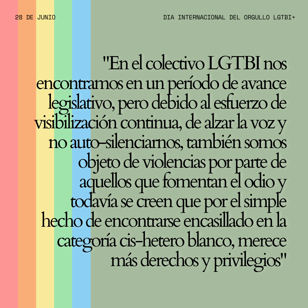 En el colectivo LGTBI nos encontramos en un período de avance legislativo, pero debido al esfuerzo de visibilización continua, de alzar la voz y no auto-silenciarnos, también somos objeto de violencias por parte de aquellos que fomentan el odio y todavía se creen que por el simple hecho de encontrarse encasillado en la categoría cis-hetero blanco, merece más derechos y privilegios.