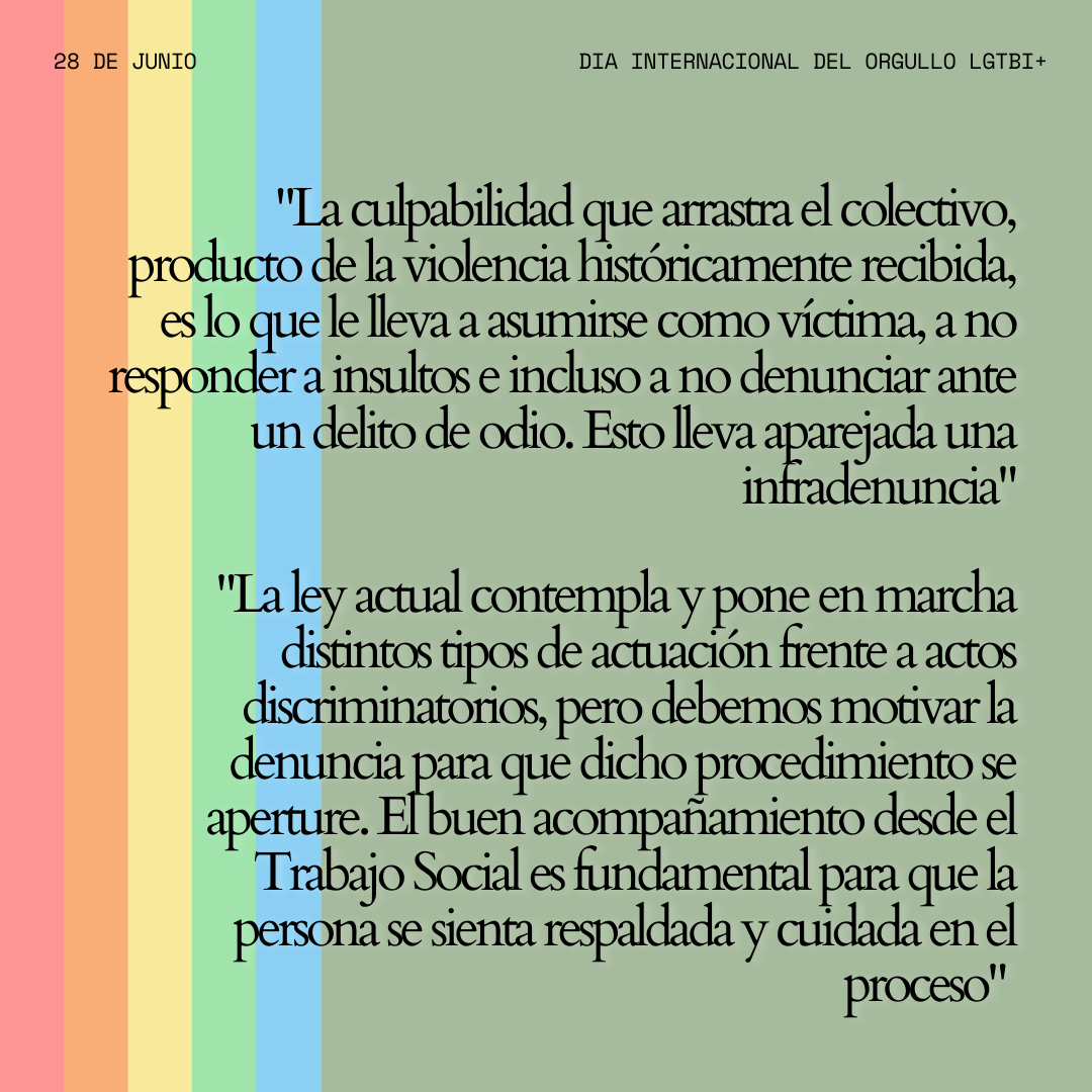 A pesar de encontrarnos respaldadas por la ley actual, a las personas que formamos parte del colectivo nos toca vivir parte o toda nuestra vida auto-revisándonos y realizando un trabajo de comprensión con nosotras mismas de una LGTBIfobia interiorizada, consecuencia de la violencia o LGTBIfobia externa recibidas. Esta culpabilidad que arrastra el colectivo, producto de la violencia históricamente recibida, es lo que nos lleva a asumirnos como víctimas, a no responder cuando recibimos insultos e incluso a no denunciar cuando somos víctimas de un delito de odio. Esto lleva aparejada una infra-denuncia. La ley actual prevee y pone en marcha distintos tipos de actuación frente a actos discriminatorios, pero debemos motivar la denuncia para que dicho procedimiento se aperture. El buen acompañamiento de las profesionales del Trabajo Social es fundamental para que la persona se sienta respaldada y cuidada en el proceso.