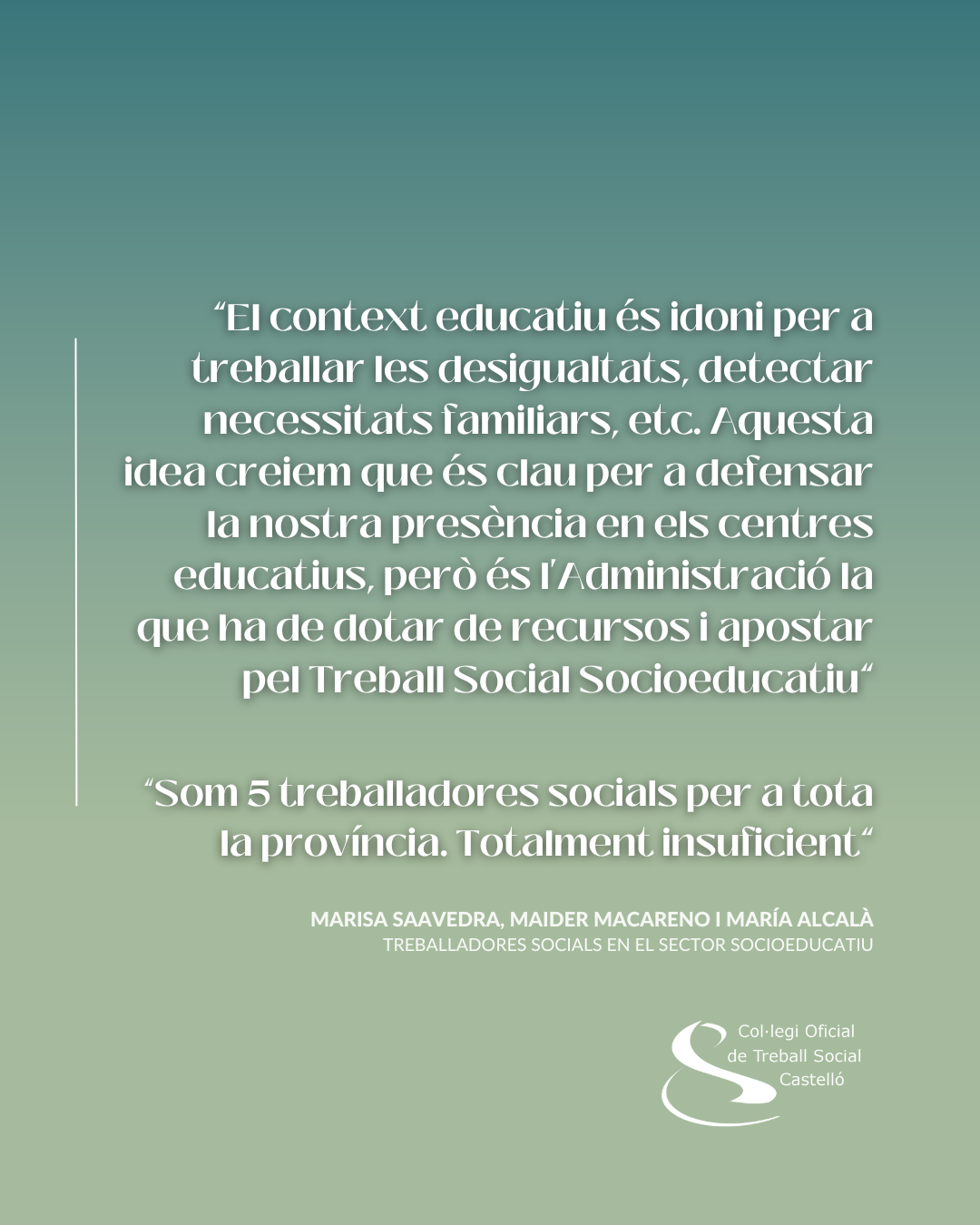 El context educatiu és un context idoni per a treballar les desigualtats, detectar necessitats familiars, etc. Aquesta idea creiem que és clau per a defensar la nostra presència en els centres educatius, però és l’Administració la que ha de dotar de recursos, repetim; la que ha d’apostar pel Treball Social Socioeducatiu.