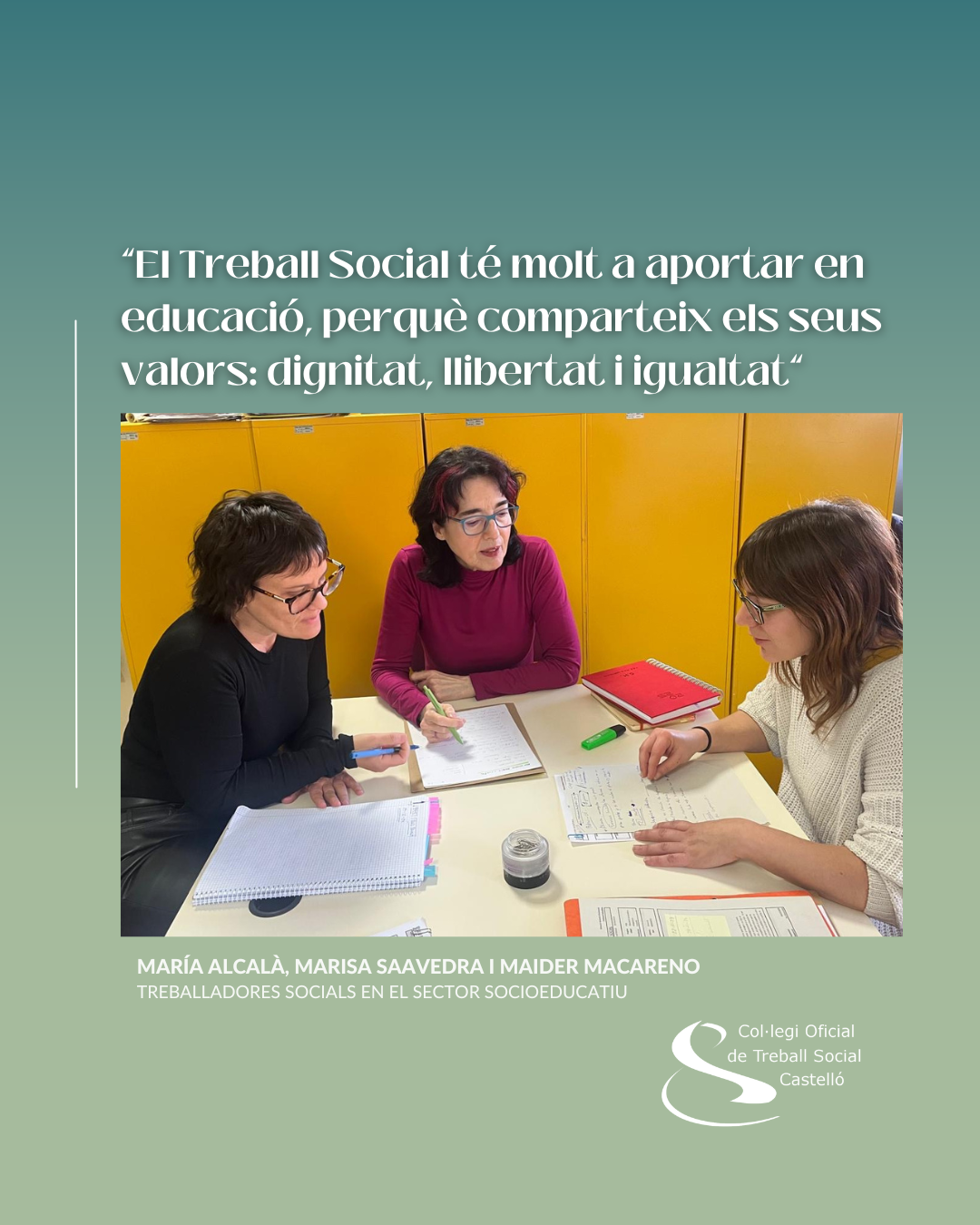 Castelló, 24/01/2025.- A Maider Macareno, Marisa Saavedra i María Alcalá els uneix el Treball Social i una aposta ferma per l’educació pública. Les tres són treballadores socials en les Unitats Especialitzades d’Orientació Educativa (UEO) de la Conselleria d’Educació a Castelló. Són tres de les cinc professionals del Treball Social que exerceixen en l’àmbit socioeducatiu a la província. Una xifra “totalment insuficient” si es té en compte, indiquen, “tot allò que el Treball Social aporta en educació, des del punt de vista de la detecció de problemàtiques, la prevenció, la sensibilització, el treball comunitari o la intervenció sociofamiliar”. Tot això és motiu “per a defensar la nostra presència en els centres educatius” però “falta una aposta des de l’Administració”. En el Dia Internacional de l’Educació, que se celebra aquest 24 de gener, des de COTS Castelló mantenim aquesta conversa a tres bandes. Una entrevista en la qual els seus tres protagonistes, reivindicacions professionals al marge, coincideixen: “Sense una educació pública i de qualitat per a tota la població, no hi ha democràcia ni justícia social”.