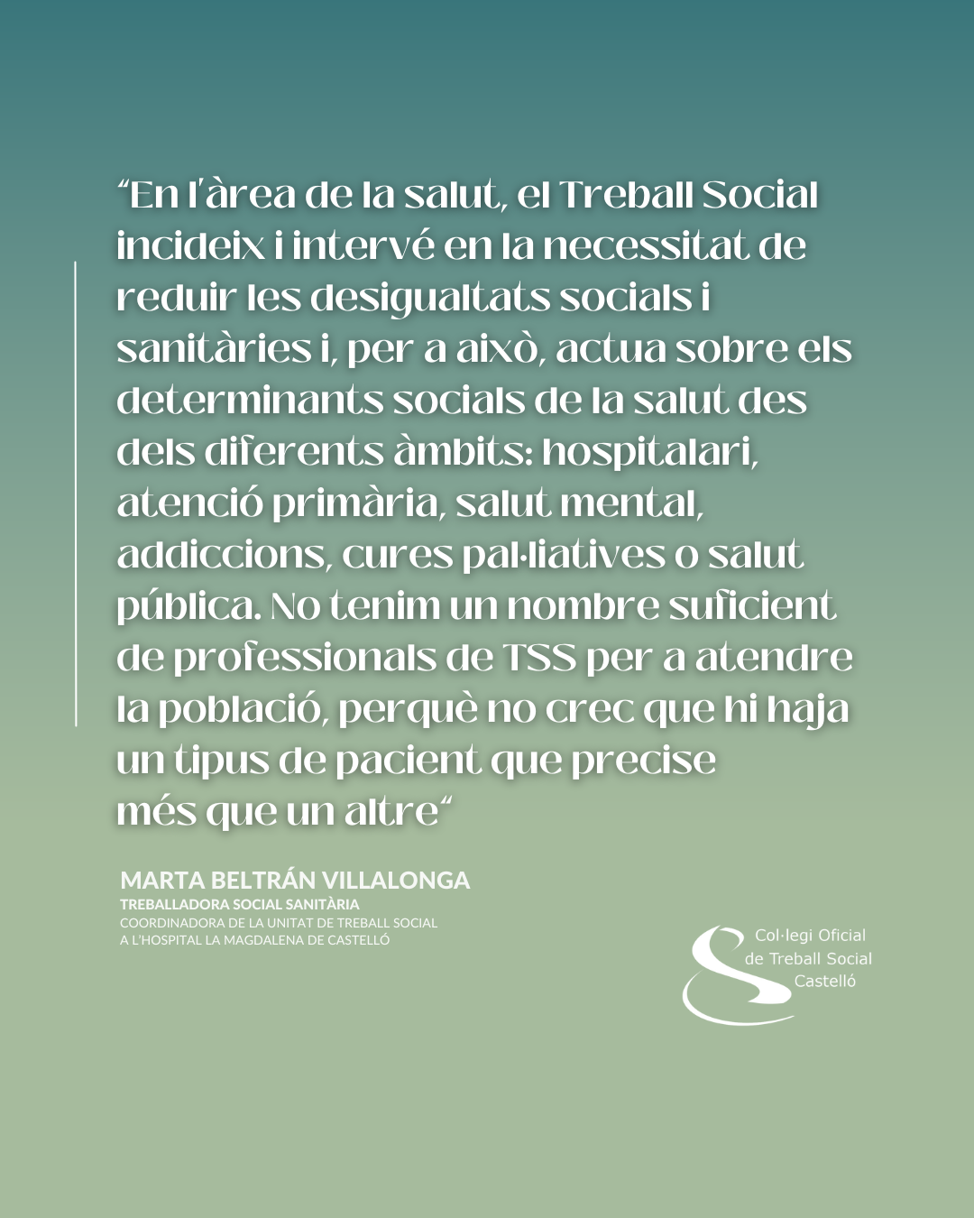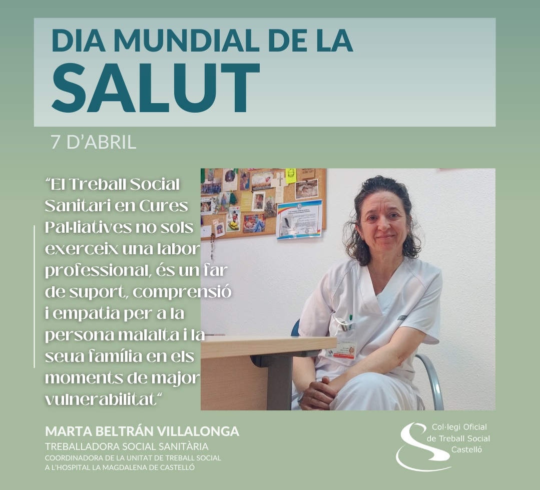 Castelló, 07/04/2025.- Reconéixer el Treball Social Sanitari (TSS) com a professió imprescindible en els equips de salut. Reivindicar la visibilitat dels seus professionals, la labor dels quals és clau per a garantir el dret a la salut – entesa com a complet benestar físic, mental i social – de totes les persones. Analitzar la intervenció del Treball Social en un camp encara desconegut com són les cures pal·liatives… De tot això parlem des de COTS Castelló, en aquesta entrevista amb motiu del Dia Mundial de la Salut, amb la nostra companya Marta Beltrán. Treballadora social a l’Hospital La Magdalena de Castelló, on coordina la Unitat de Treball Social, forma part de l’equip de professionals que treballa en Cures Pal·liatives, Medicina Interna per a convalescència i llarga estada, i les Consultes Externes de la Unitat de Neurologia de la Conducta i Demències (la unitat de referència de la província).