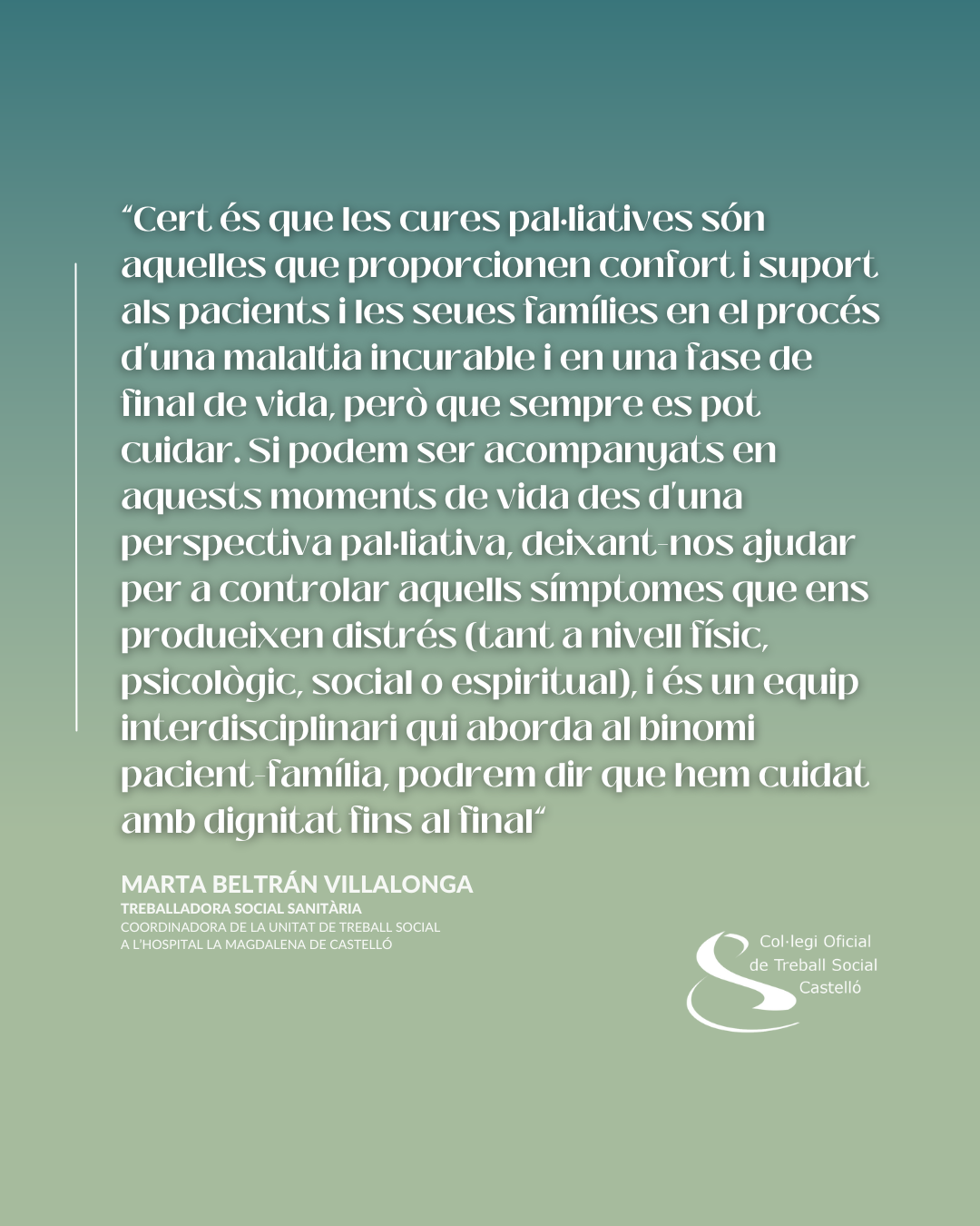 Marta Beltrán: “El Treball Social Sanitari en Cures Pal·liatives no sols exerceix una labor professional, és un far de suport, comprensió i empatia per a la persona malalta i la seua família en els moments de major vulnerabilitat”
