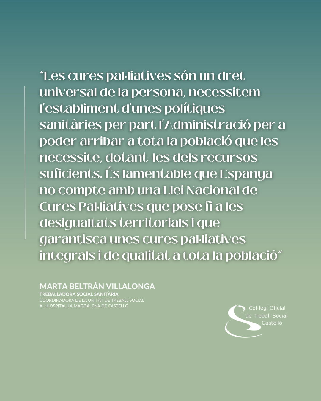- En aquesta entrevista amb motiu del Dia Mundial de la Salut, la treballadora social Marta Beltrán reivindica una Llei Nacional de Cures Pal·liatives “que pose fi a les desigualtats territorials” i garantisca el seu accés “de manera integral i des de la qualitat a tota la població”
