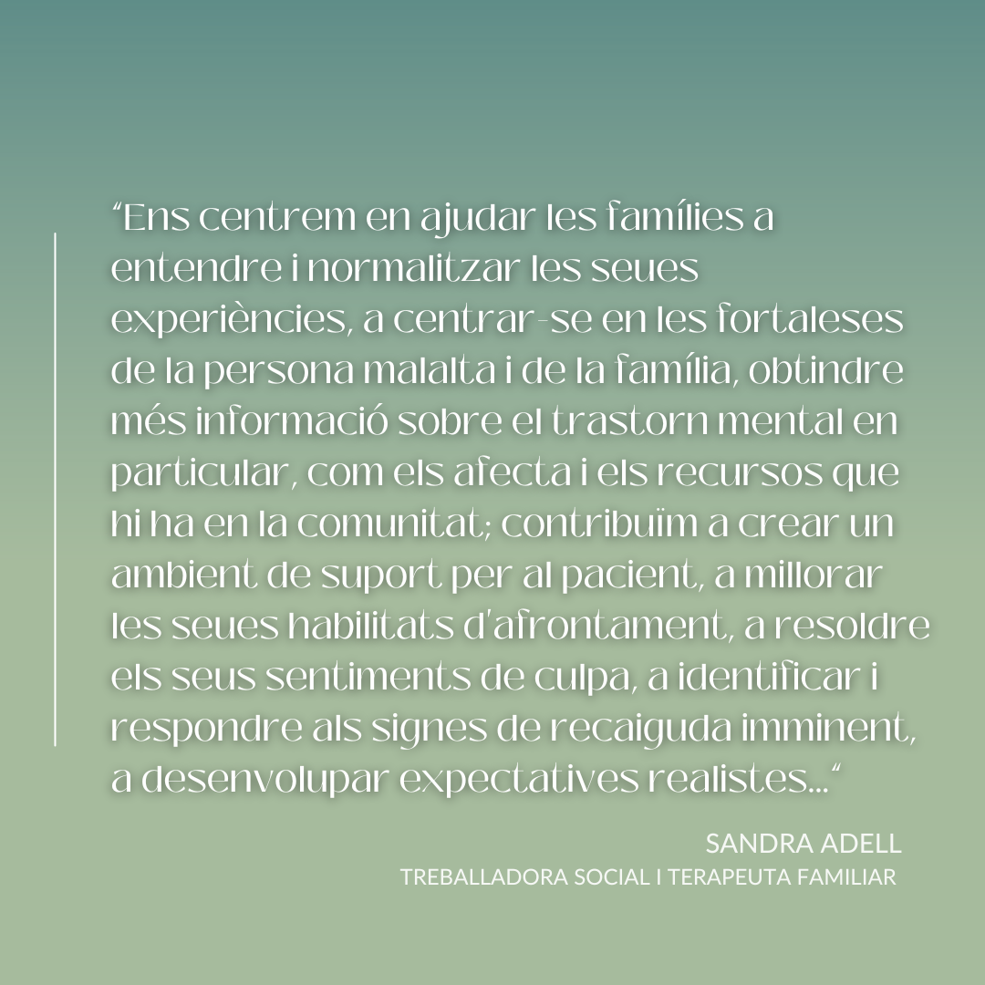En general en aquest i altres dispositius de salut mental, ens centrem en ajudar les famílies a entendre i normalitzar les seues experiències, a centrar-se en les fortaleses de la persona malalta i de la família, obtindre més informació sobre el trastorn mental en particular, com els afecta i els recursos que hi ha en la comunitat, a crear un ambient de suport, a millorar les seues habilitats d’afrontament, a resoldre els seus sentiments de culpa, a identificar i respondre als signes de recaiguda imminent, a desenvolupar expectatives realistes… Això unit a molta burocràcia, nombroses i extenses coordinacions amb altres sistemes de benestar, etc.