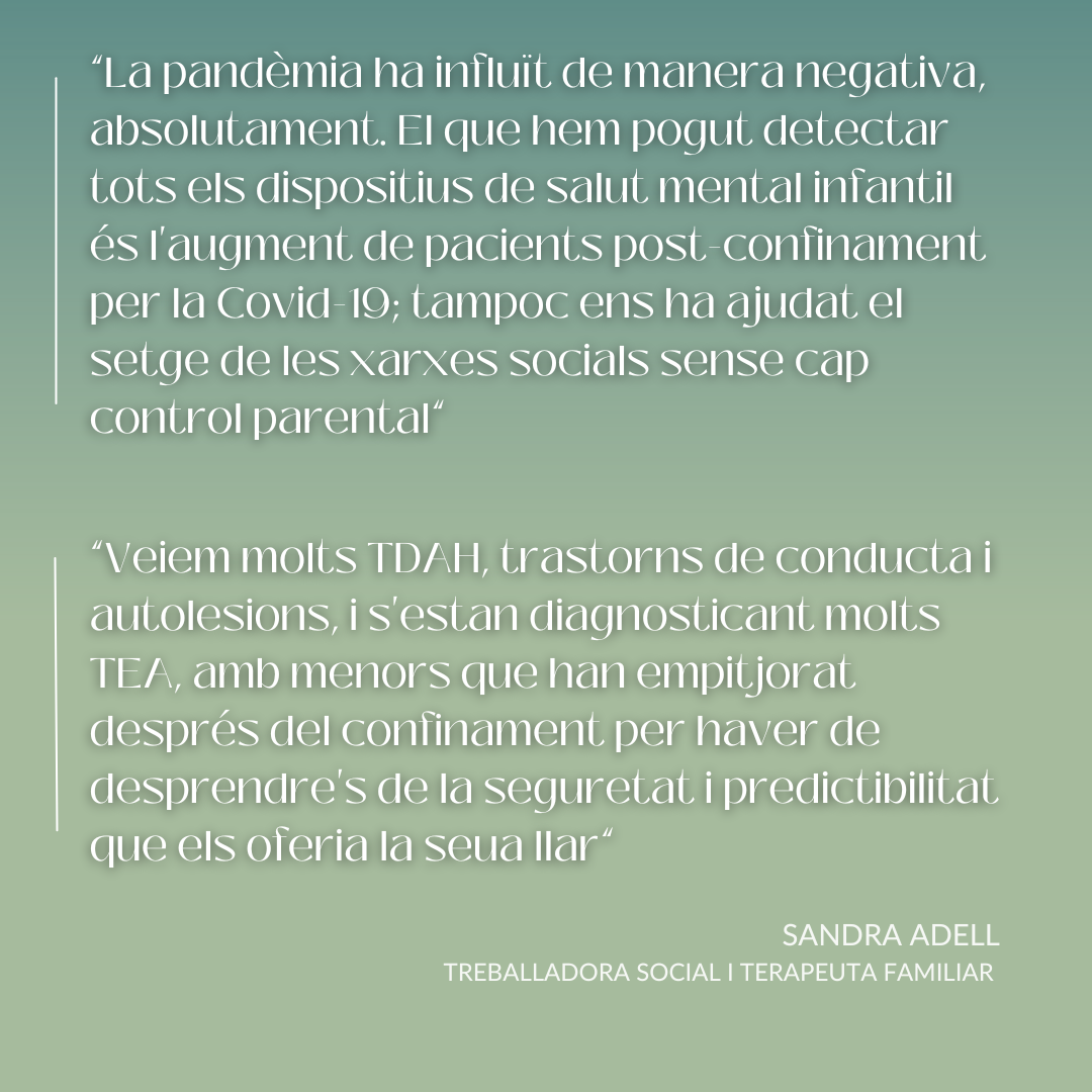 R.- La pandèmia ha influït de manera negativa, absolutament. El que hem pogut detectar tots els dispositius de salut mental infantil és l’augment de pacients post-confinament per pandèmia covid19. Són xiquets, xiquetes i adolescents que han viscut el confinament bé per compartir temps amb els seus pares, mares, progenitors, i han trobat la llar com a espai segur i de comunicació i trobada. És essencial la necessitat d’aquests joves de passar major temps de qualitat amb els seus pares i mares.
