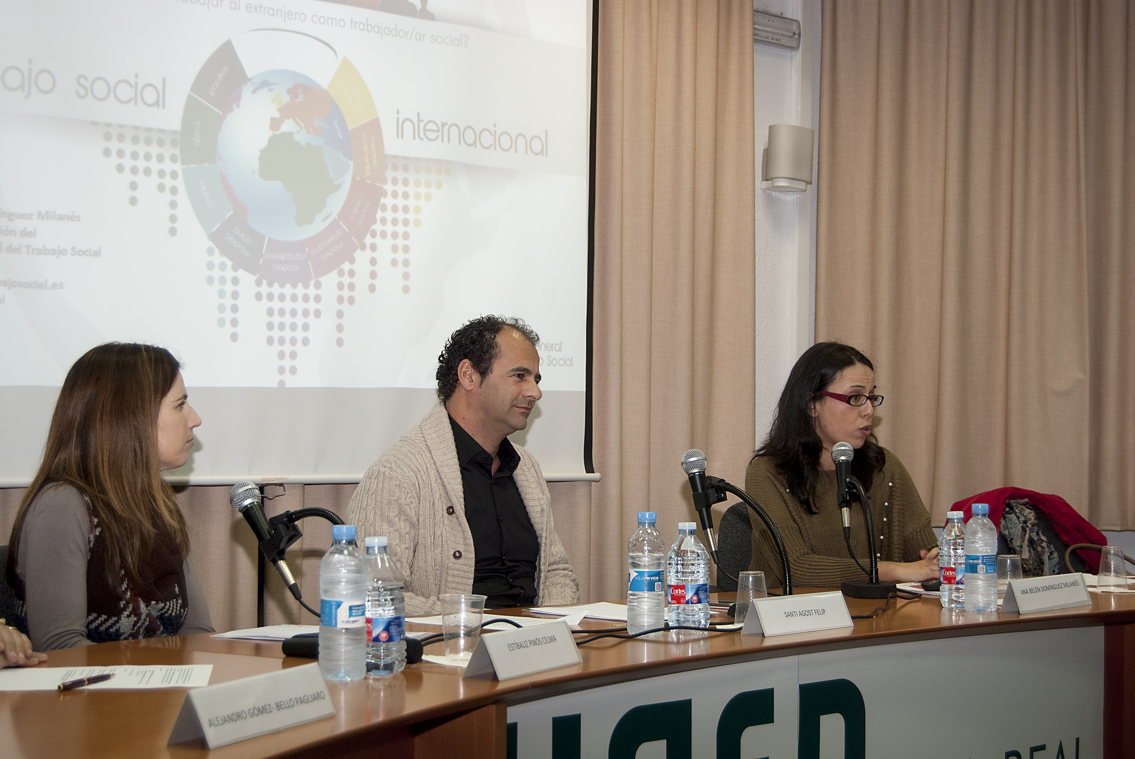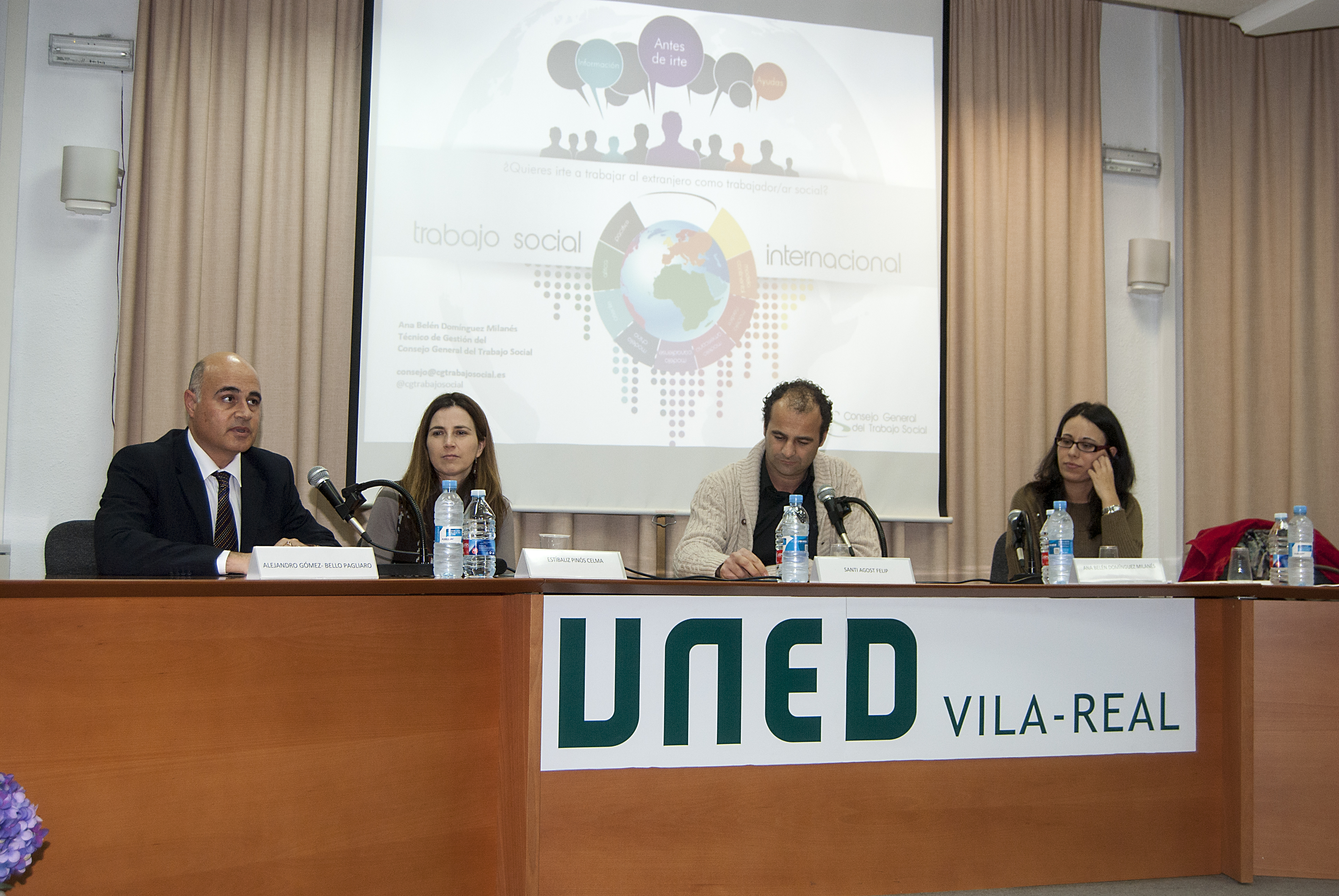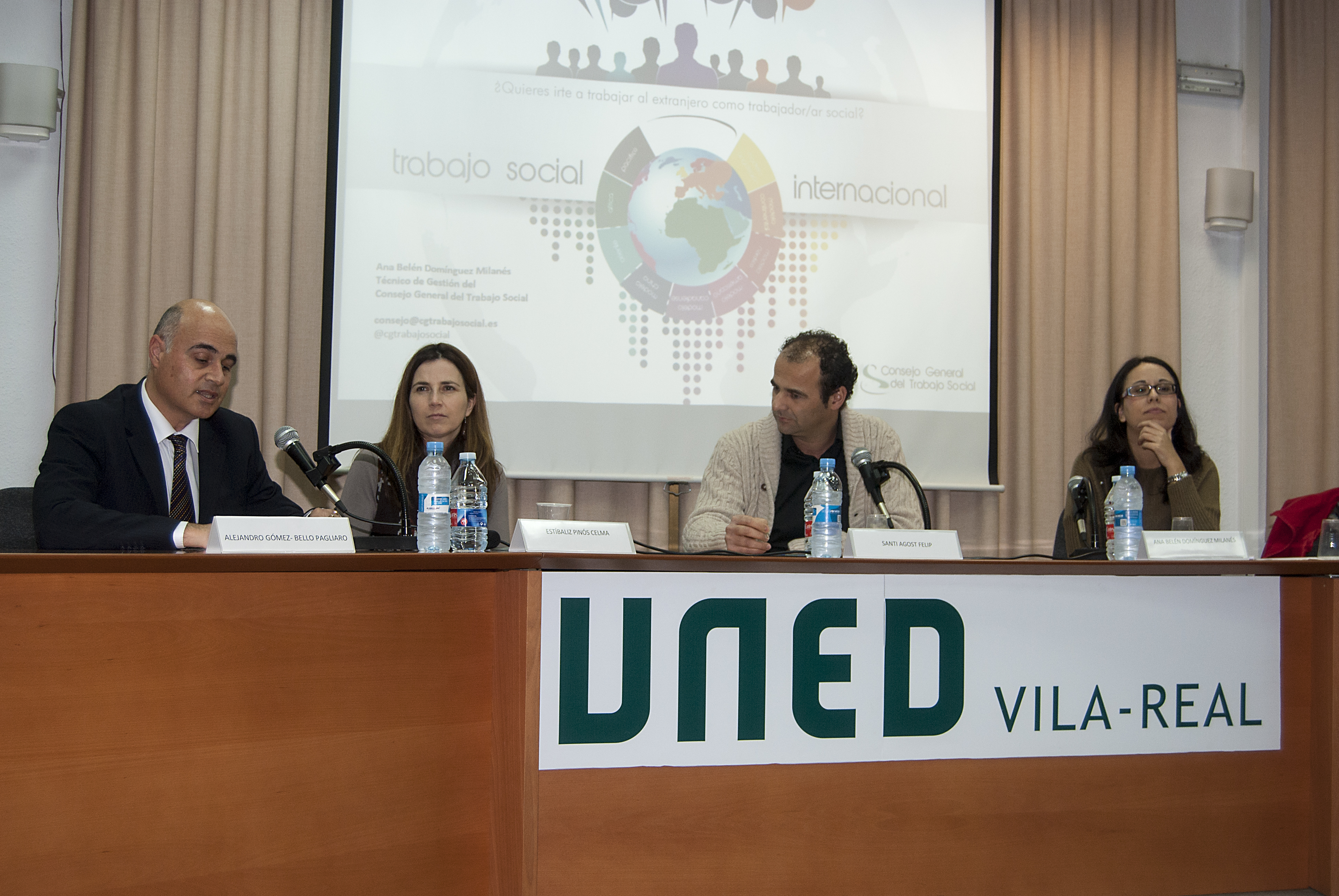 En la ponencia intervinieron Alejandro Gómez-Bello Pagliaro, abogado y profesor-tutor del centro asociado a la UNED en Vila-real, Santi Agost, representante del Colegio Oficial de Trabajo Social de Castellón, Ana Belén Domínguez Milanés, técnica de Gestión del Consejo General del Trabajo Social, Estíbaliz Pinós Celma, Trabajadora social en Francia y Raúl Soriano, experiencia profesional en Australia (conexión por videoconferencia).