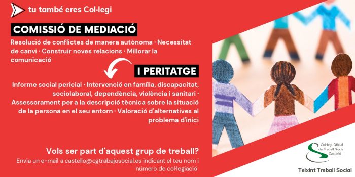 Castelló, 26/04/2022.- Des del Col·legi Oficial de Treball Social de Castelló posem en marxa la Comissió de Mediació i Peritatge. Dos conceptes molt lligats a la professió i a la intervenció social que regeix el dia a dia del col·lectiu, i que donen forma a aquest nou grup de treball. Igual que amb les ja activades Comissions de Serveis Socials i de Sanitat, busquem sumar punts de vista, experiències i coneixements per a fer front als reptes que tenim per davant i que engloben a totes les àrees d’intervenció social sobre les quals es vertebra la nostra labor.