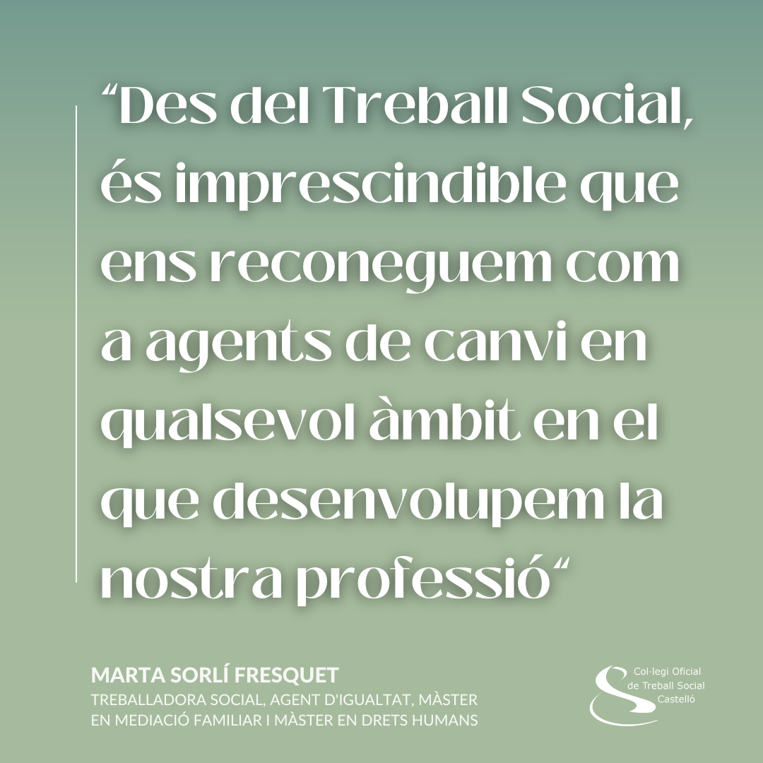 És per això que, des del treball social, és imprescindible que ens reconeguem com a agents de canvi en qualsevol àmbit en el que desenvolupem el nostre treball. La violència masclista va més enllà dels serveis especialitzats i aquelles ulleres morades, de les que tant es parla en feminisme, fan falta en qualsevol àmbit de treball. Ens cal formar-nos i reciclar-nos, saber que darrere d una ajuda d emergència, d una addicció o d una intervenció sanitària pot haver una desigualtat masclista que nosaltres, amb la nostra intervenció, podem transformar.