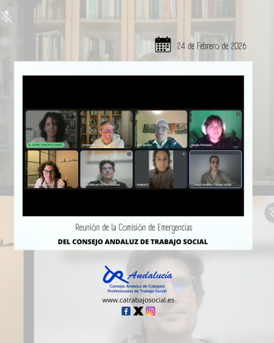El martes 24 de febrero, de 17:00 a 19:00 horas, se celebró de forma telemática la reunión de la Comisión de Emergencias del Consejo Andaluz de Trabajo Social, con el objetivo de abordar las recientes situaciones de emergencia y avanzar en la planificación estratégica para el año 2026.