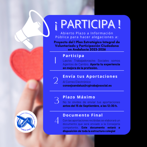 Resolución de 25 de julio de 2023, de la Secretaría General Técnica de la Consejería de Inclusión Social, Juventud, Familias e Igualdad, por la que se acuerda someter a INFORMACIÓN PÚBLICA el «Proyecto del I Plan Estratégico Integral de Voluntariado y Participación Ciudadana en Andalucía 2023-2026».