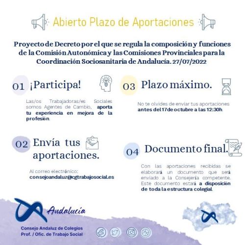 Abierto Plazo de Aportaciones para las Entidades Integrantes del Pleno del Consejo de Servicios Sociales de Andalucía sobre el Proyecto de Decreto por el que se regula la composición y funciones de la Comisión Autonómica y las Comisiones Provinciales para la Coordinación Sociosanitaria de Andalucía. 27/07/2022
