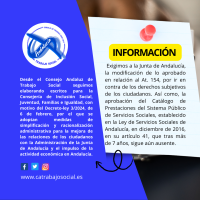 Exigimos a la Junta de Andalucía, la modificación de lo aprobado en relación al Artículo 1544, por ir en contra de los derechos subjetivos de la ciudadanía. Así como, la aprobación del catálogo de prestaciones del Sistema Público de Servicios Sociales, establecido en la Ley de Servicios Sociales de Andalucía, en diciembre de 2016, en su artículo 41, que tras más de 7 años, sigue aún ausente.