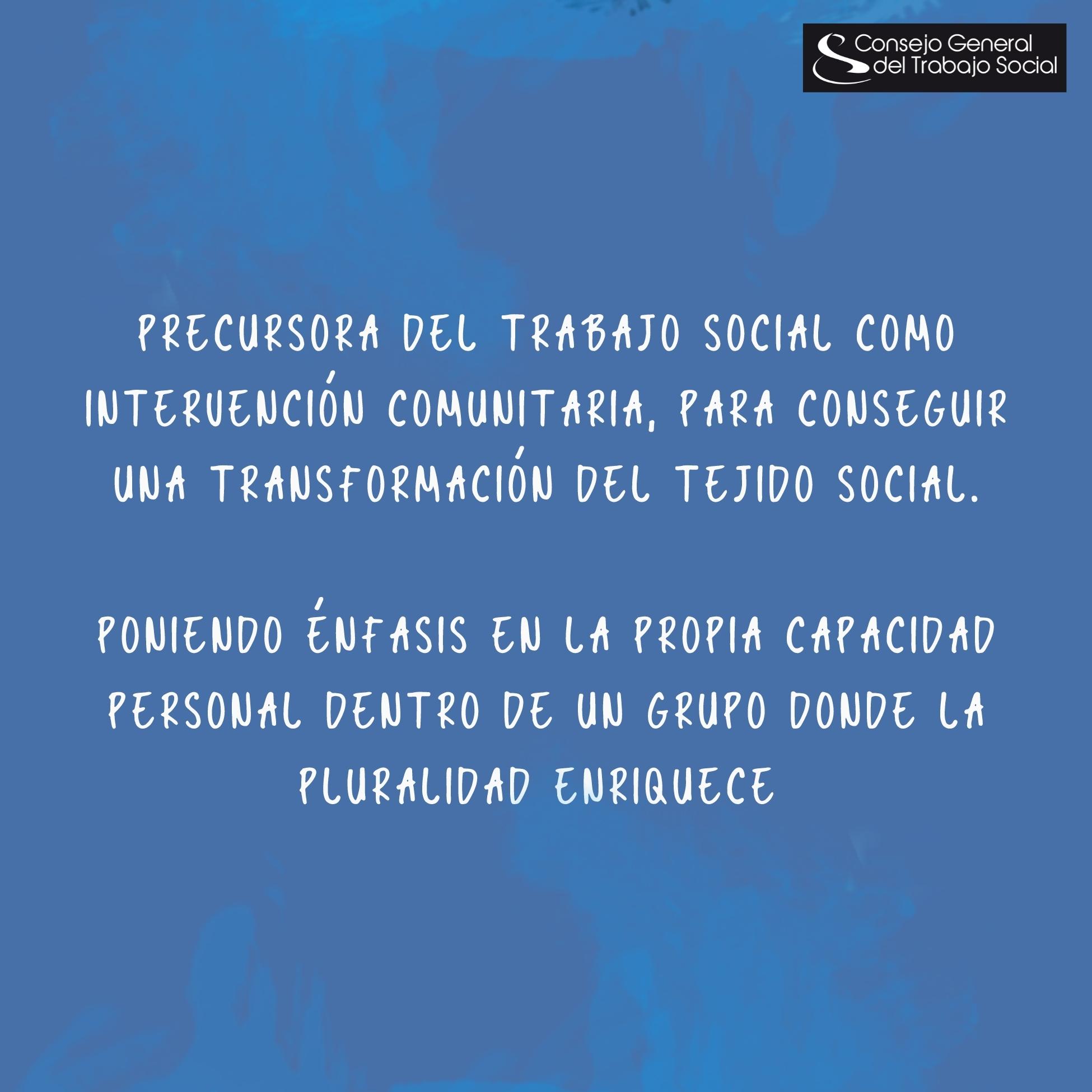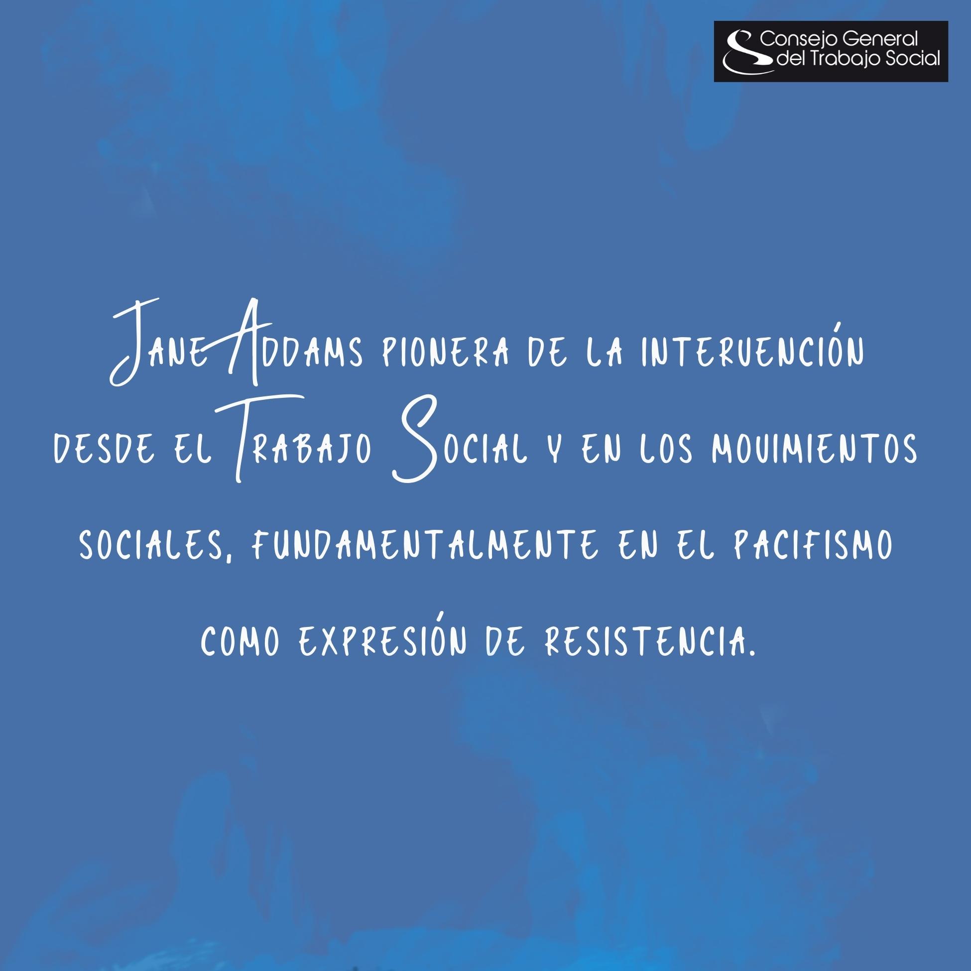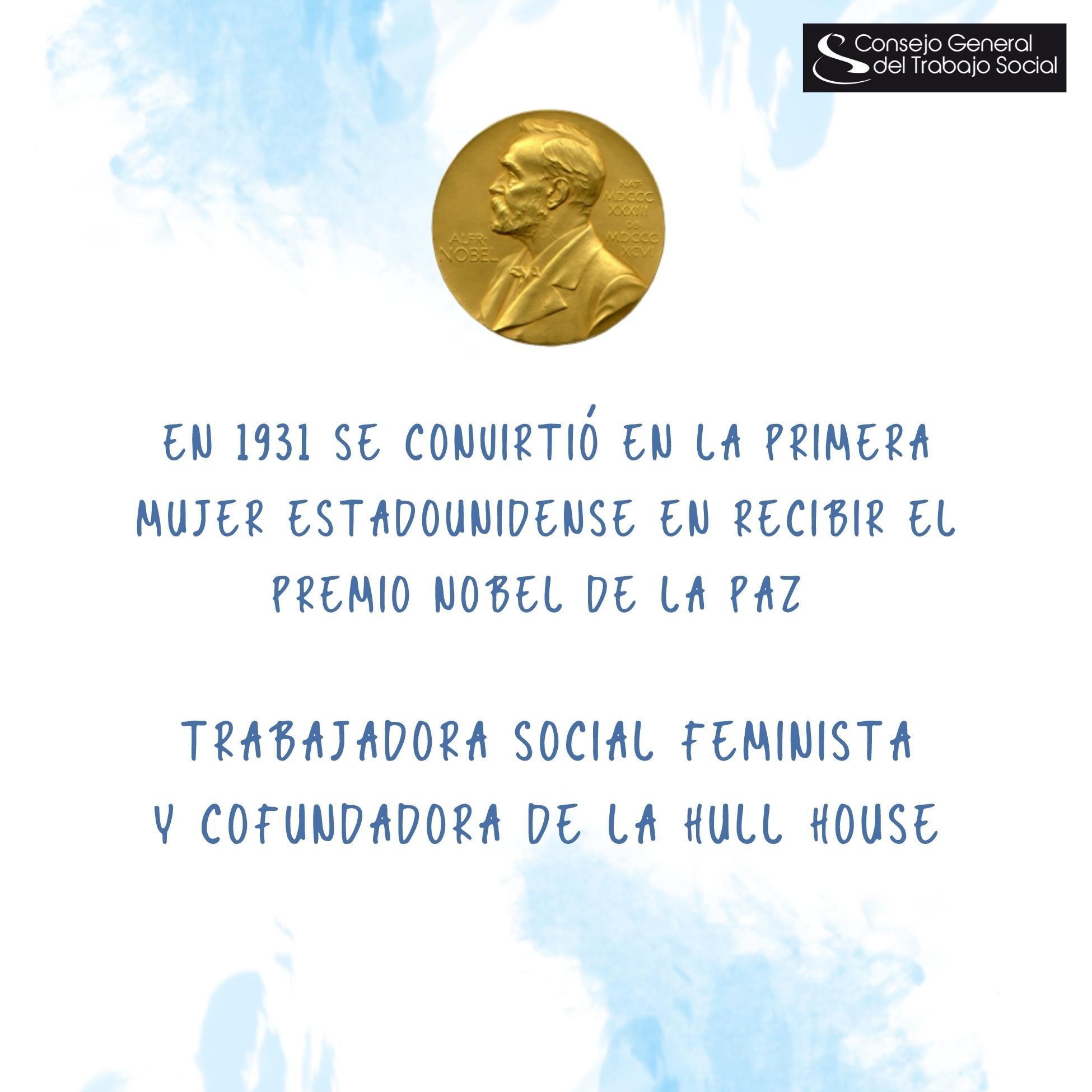 En 1931 Jane Addams se convirtió en la primera mujer estadounidense galardonada con el Premio Nobel de la Paz. Addams fue “pionera de la intervención desde el Trabajo Social en los movimientos sociales, fundamentalmente en el pacifismo como expresión de resistencia […] En su mano el trabajo social de casos se convirtió en una herramienta para rescatar las relaciones humanas […] Precursora del trabajo social como intervención comunitaria, para conseguir una transformación del tejido social, se robustece más la propia capacidad personal dentro de un grupo en donde la pluralidad enriquece”, afirma Remedios Maurandi Guirado en su artículo ‘Jane Addams: una figura clave en el origen del Trabajo Social’, publicado en el número 52 de la revista ‘Servicios Sociales y Política Social’.