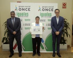 - Fernando Riaño, director de Relaciones Institucionales y Responsabilidad Social Corporativa del Grupo Social ONCE, y José Luis Pinto, vicepresidente 2º de Estrategia Económica, Juego y Desarrollo Empresarial del Consejo General de la ONCE, han hecho entrega del cupón conmemorativo de la ONCE por el 40 aniversario de los colegios oficiales de Trabajo Social a Emiliana Vicente, presidenta del Consejo General del Trabajo Social (CGTS), en un sencillo acto que ha tenido lugar hoy en la sede del Consejo General de la ONCE.