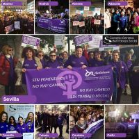 Con los lemas #NiUnPasoAtrásEnIgualdad, #TSFeminismo, #SinFeminismoNoHayIgualdad, entre otros, muchas/os trabajadores sociales se manifestaron por toda la geografía española en las más de 90 ciudades donde se organizaron actos.
