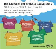 Desde la Federación Internacional de Trabajadores sociales ya están preparando la celebración del Día Mundial del Trabajo Social 2014, que se celebrará el martes 18 de marzo de 2014, animando a todos los trabajador@s sociales, miembros y organizaciones asociadas a celebrarlo. El tema de este año se basa en proponer soluciones del Trabajo Social a la crisis social y económica, bajo el título “Crisis social y financiera. Soluciones desde el Trabajo Social”. El póster de este año incluye imágenes de camisetas con mensajes del trabajo social, haciendo un guiño a las camisetas utilizadas en las diferentes campañas que se están llevando acabo a lo largo de todo el mundo por trabajadores/as sociales.