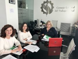 La presidenta del Consejo General del Trabajo Social, Ana I. Lima Fernández, la vocal de la Junta del Colegio Oficial de Trabajo Social de Madrid y experta en Trabajo Social y Justicia Ana García Montero y la asesora jurídica del Consejo, Esther Goñi, han sido recibidas por el Director General de Relaciones con la Administración de Justicia, Joaquín Delgado Martín.