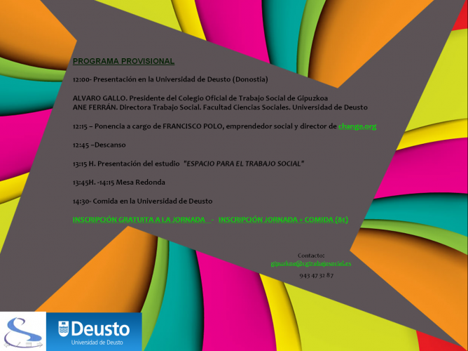 Desde el Colegio Oficial de Trabajo Social de Gipuzkoa y la Universidad de Deusto se ha organizado una Jornada el día 19 de marzo de 2013 para celebrar el Día Mundial del Trabajo Social y presentar el estudio cualitativo realizado sobre el perfil de las/os Trabajadoras/es Sociales de Gipuzkoa: “Espacio para el Trabajo Social”, con el fin de reflexionar sobre la profesión.
