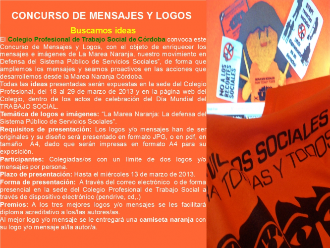 También se convoca el I CONCURSO DE MENSAJES Y LOGOS, con el objeto de enriquecer los mensajes e imágenes de la MAREA NARANJA , nuestro movimiento en defensa del sistema público de servicios sociales. Todas las ideas presentadas serán expuestas en la sede del CPTS Córdoba del 18 al 29 de marzo 2013 y en la página web del CPTS Córdoba.
