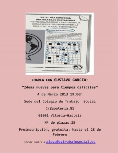 Como celebración del Día Internacional del Trabajo Social, el Colegio de Álava organiza una Charla con Gustavo García, de la Asociación de Directoras y Gerentes de Centros de Servicios Sociales, el próximo 4 de Marzo, a las 19h, en la sede del Colegio (C/ Zapateria 81, bajo, 01001 Vitoria).