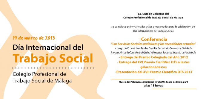 La Junta de Gobierno del Colegio Profesional de Trabajo Social se complace en invitaros a los actos programados para la celebración del Día Internacional del Trabajo Social: