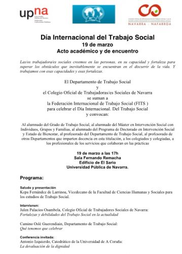 El Colegio de Diplomado en Trabajo Social y AA.SS de Navarra y la Universidad Pública de Navarra han organizado un acto el día 19 de marzo para celebra el día Internacional de Trabajo Social.