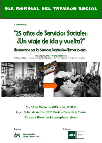 Para celebrar el Día Mundial del Trabajo Social, el Colegio Oficial de Trabajo Social Soria ha organizado una Conferencia el día 19 de marzo, que la impartirá Gustavo García Herrero. Esta Actividad está destinada a la formación permanente de todos los profesionales y hacer visible nuestra profesión en la semana que celebramos el día mundial.
