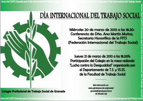 El día 21 de marzo (jueves) a las 18.00h, el Colegio estará presente en la mesa redonda “Lucha contra la Desigualdad” que organiza el Departamento de TS y Servicios Sociales de la Facultad de Trabajo Social de Granada.