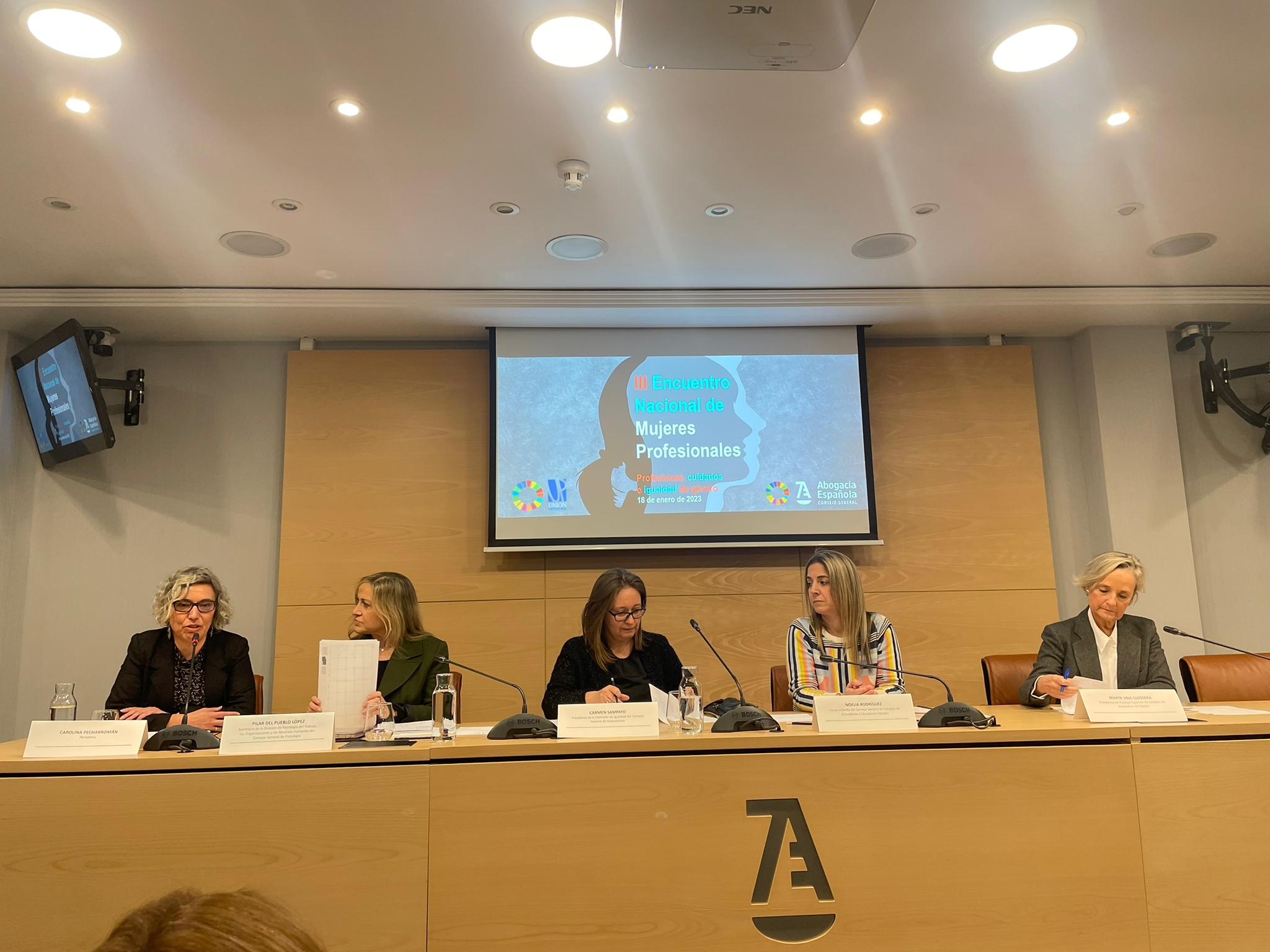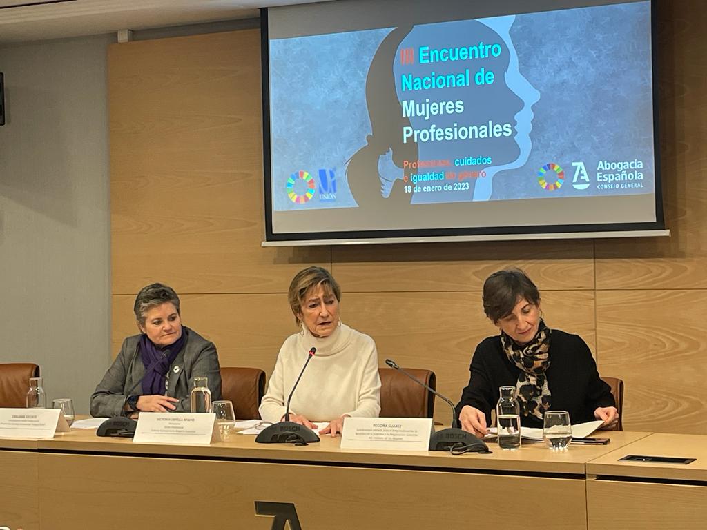 Emiliana Vicente, Presidenta del Consejo General del Trabajo social y vicetesorera de Unión Profesional participa en la bienvenida de la nueva edición del Encuentro Nacional de Mujeres Profesionales, organizado por el Consejo General de la Abogacía y Unión Profesional. En esta ocasión, el encuentro estará centrado en la temática Profesiones, cuidados e igualdad de género