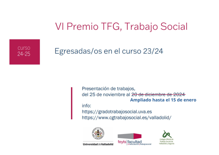 El plazo de presentación de solicitudes se extenderá hasta el día 15 de enero de 2025. La entrega de trabajos puede realizarse por correo certificado o personalmente en la secretaría del Colegio Oficial de Trabajo Social de Valladolid y Segovia, así como en el negociado de alumnos de la Facultad de Educación y Trabajo Social de la UVa.