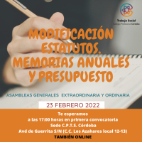 En virtud del Artículo 22 de los Estatutos del Colegio Profesional de Trabajo Social de Córdoba, se convocan ASAMBLEAS GENERALES EXTRAORDINARIA Y ORDINARIA a celebrar el próximo 23 de febrero de 2023, en modalidad presencial y telemática.