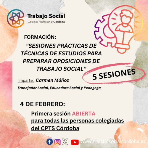 Horariodel miércoles 04 de Febrero al miércoles 03 de Junio de 2026Te informamos sobre la nueva formación online: “SESIONES PRÁCTICAS DE TÉCNICAS DE ESTUDIOS PARA PREPARAR OPOSICIONES DE TRABAJO SOCIAL”, organizado por nuestro Colegio Profesional e impartido por Carmen Núñez, trabajadora social, educadora social y pedagoga.