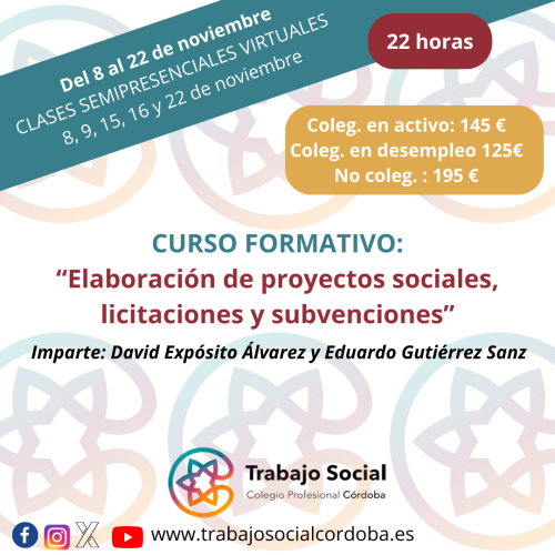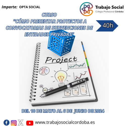 Horariodel lunes 03 de Marzo al domingo 06 de Abril de 2025Te informamos sobre el nuevo Curso online “Gestionar con éxito Proyectos Sociales: Diseño, Evaluación y Presentación a convocatorias privadas”, organizado por nuestro Colegio Profesional e impartido por Opta Servicios Integrados