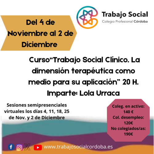 Horariodel lunes 24 de Marzo al sábado 24 de Mayo de 2025Te informamos sobre el nuevo Curso online “Trabajo Social Sanitario en el Ámbito Hospitalario, Atención Primaria, Salud Mental, Urgencias y Emergencias”, organizado por nuestro Colegio Profesional e impartido por Julio Piedra Cristóbal y Juan Jesús Rosa Martín