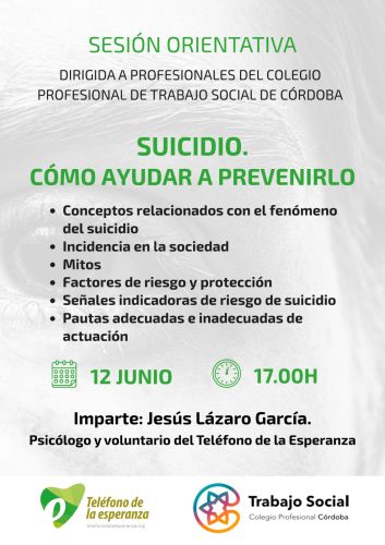 Te informamos sobre la charla presencial que tendrá lugar en nuestra sede sobre “Suicidio. Cómo ayudar a prevenirlo”, organizado por nuestro Colegio Profesional e impartido por Jesús Lázaro García. Psicólogo y voluntario del Teléfono de la Esperanza