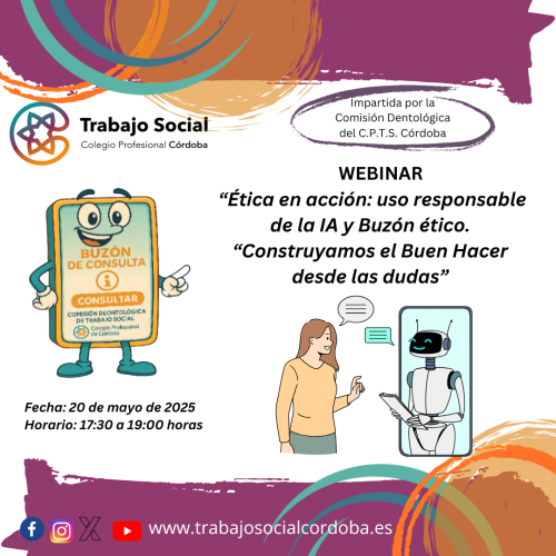 Te informamos sobre la Webinar online sobre “Ética en acción: uso responsable de la IA y Buzón ético. “Construyamos el Buen Hacer desde las dudas”, organizada e impartida por la Comisión Deontológica del Colegio Profesional de Trabajo Social de Córdoba