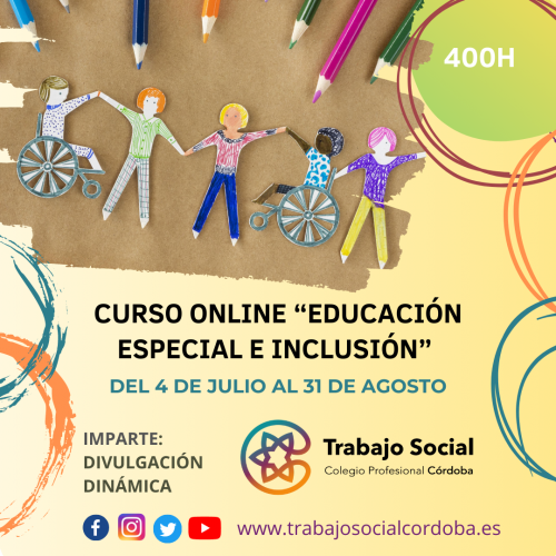 Horariodel lunes 04 de Julio al miércoles 31 de Agosto de 2022Te informamos sobre el nuevo curso online “EDUCACION ESPECIAL E INCLUSION”, organizado por nuestro Colegio Profesional e impartido por Divulgación Dinámica: