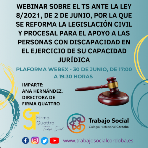 Ya puedes inscribirte en la Webinar gratuita “SOBRE EL TS ANTE LA LEY 8/2021, DE 2 DE JUNIO, POR LA QUE SE REFORMA LA LEGISLACIÓN CIVIL Y PROCESAL PARA EL APOYO A LAS PERSONAS CON DISCAPACIDAD EN EL EJERCICIO DE SU CAPACIDAD JURÍDICA” organizada por el Colegio Profesional de Trabajo Social de Córdoba e impartida por Ana Hernández (Trabajadora Social y Directora de Firma Quattro)