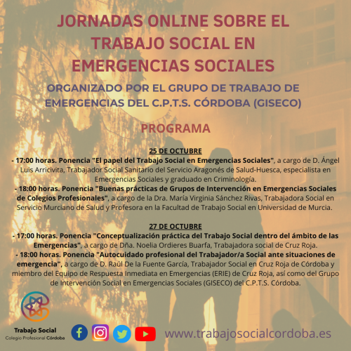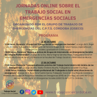 Desde el Grupo de Trabajo de Emergencias Sociales del Colegio Profesional de Trabajo Social de Córdoba (GISECO) presentamos las Jornadas Online sobre Trabajo Social en Emergencias Sociales, con la intención de dar a conocer la labor del Trabajador/a Social dentro del campo de las emergencias por parte de expertos en la materia y con experiencia, que podrán exponer sus vivencias, esperando que sea de vuestro interés y animando a la participación en el Grupo de Trabajo de Emergencias Sociales del Colegio.