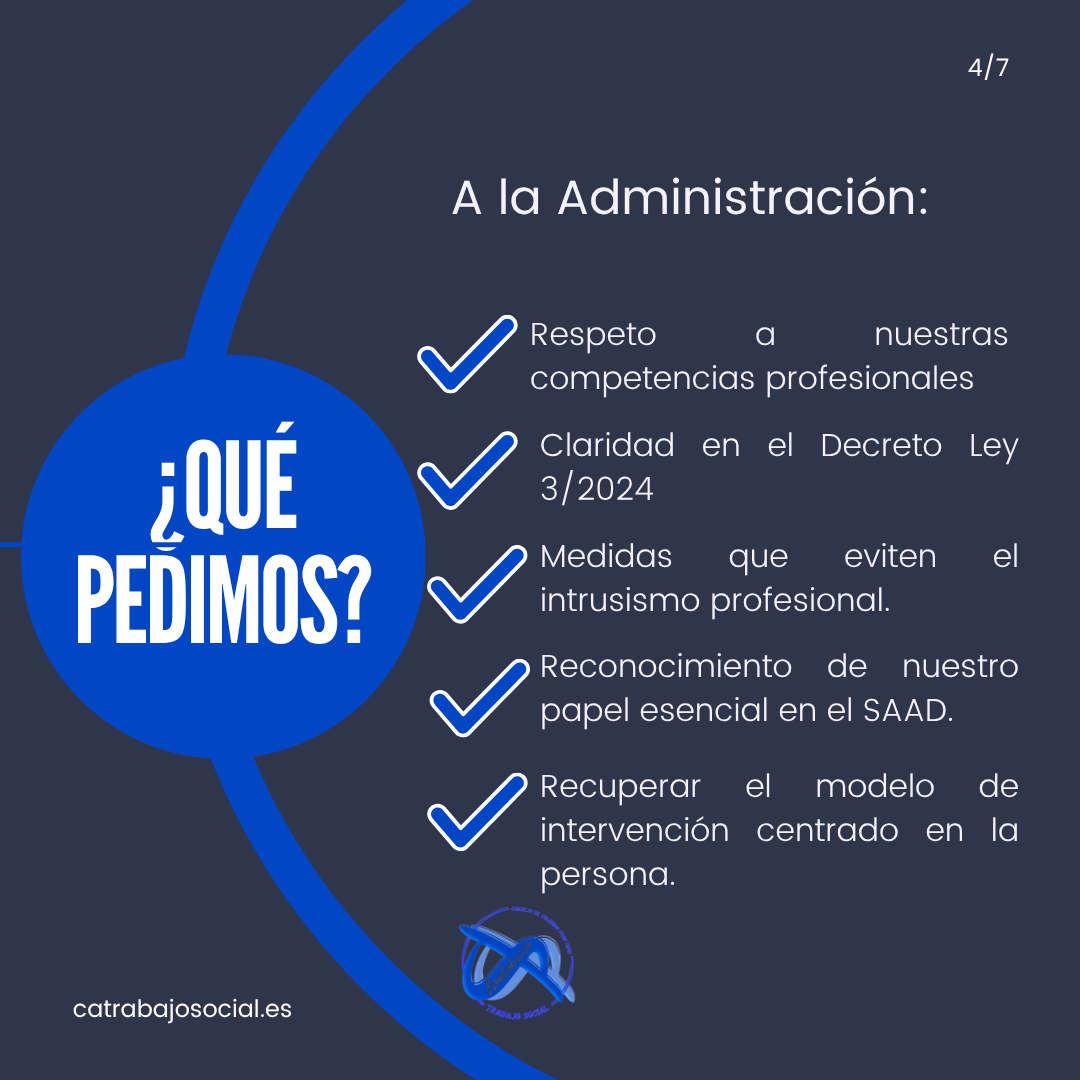4. Reivindicamos el papel esencial del Trabajo Social en el Sistema para la Autonomía y la Atención a la Dependencia, como garante del acompañamiento profesional, de calidad y en defensa de los derechos de la ciudadanía.
