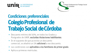 Le informamos que el Colegio Profesional de Trabajo Social de Córdoba ha abierto un nuevo convenio con la UNIR, con el que podrás beneficiarte de condiciones especiales y ventajosas para tu formación que puedes consultar en el siguiente enlace.