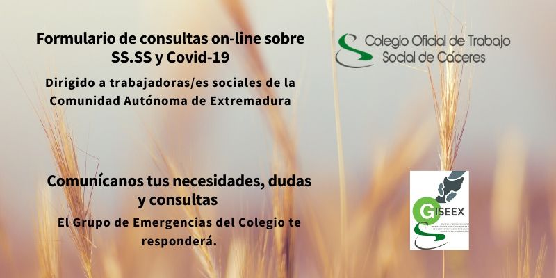 El Grupo de Emergencias del Colegio Oficial de Trabajo Social de Cáceres han creado una Guía web de Recursos Sociales y un Formulario de Consultas, duas y/o sugenrencias para ofrecer apoyo y orientación profesional a sus colegiados/as. |